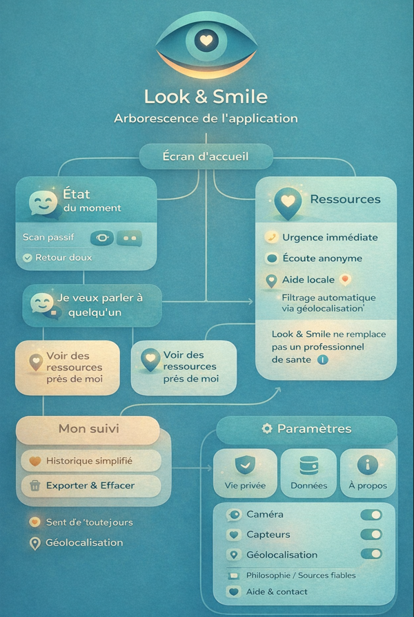 DESCRIPTION DU PROJET • Application gratuite, centrée sur la prévention de la dépression et du risque suicidaire, destinée en priorité aux adolescents et jeunes adultes, très touchés par les troubles de santé mentale (en France, 14% des collégiens et 15% des lycéens présentent un risque important de dépression). • Utilisation de la caméra et de capteurs de l’appareil pour analyser, avec l’accord explicite de l’utilisateur, certains indicateurs non médicaux : baisse d’expressivité faciale, évitement du regard, ralentissement ou agitation gestuelle, changements de rythme d’utilisation, afin de détecter des évolutions préoccupantes et déclencher des alertes bienveillantes. • En cas de risque repéré, géolocalisation des besoins et mise en relation rapide avec des ressources adaptées : numéros d’urgence, lignes d’écoute (type SOS), centres médico psychologiques, associations locales, services hospitaliers, en fonction du pays et de la région de l’utilisateur, sans diagnostic ni prescription. |